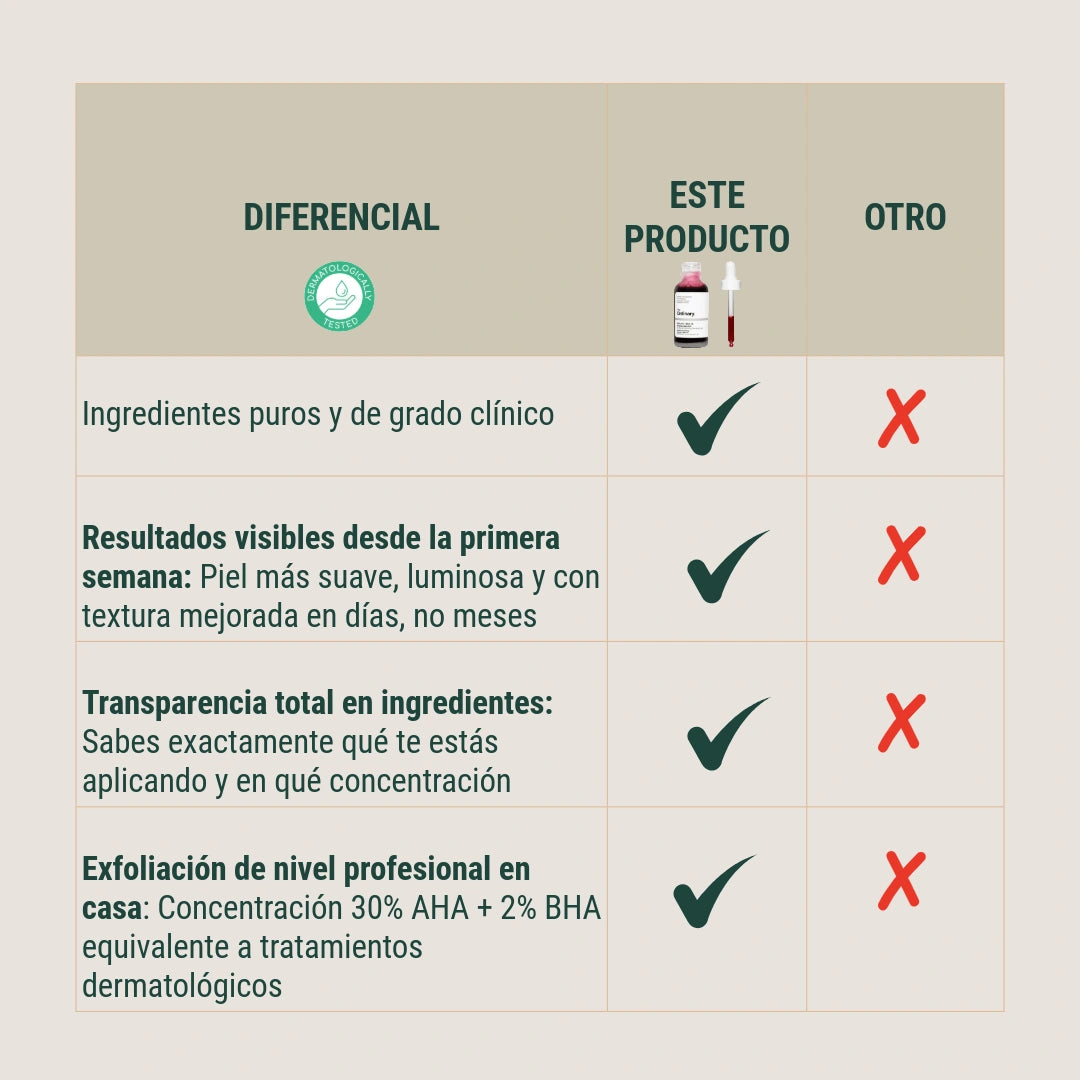 Su mezcla de alfa hidroxiácidos (30%) y beta hidroxiácidos (2%) exfolia en profundidad, elimina impurezas y atenúa manchas.